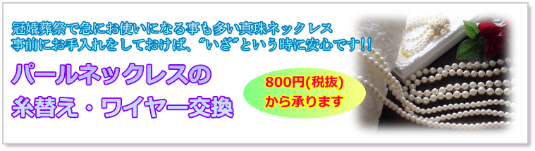 | ・冠婚葬祭で急にお使いになる事も多い真珠ネックレスの糸替え・ワイヤー交換を800円(税抜)からお承りしています。 |