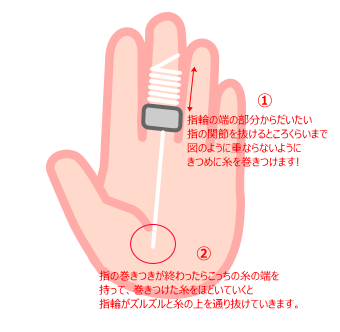 2. 指と指輪の間にタコ糸を通し、通した糸を指に巻きつけ、反対側の