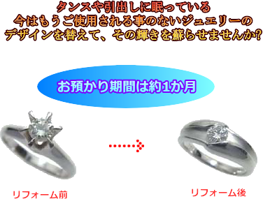 お客様のお持ちのリングを違うデザインの石付きのリングへリフォームする場合の参考価例です。 |